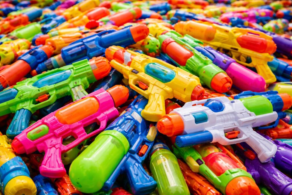 Nearly everyone of all ages is armed with a water gun during Songkran celebrations in Bangkok. The city aims to eliminate the number of water pistols that end up in waste bins with minimal impact on festivities. (Source: Expatliving)