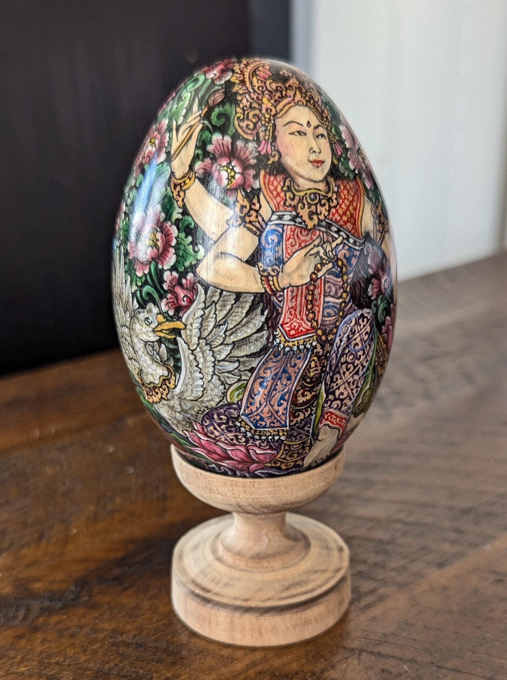 Hand-painted egg (lukisan telur) by the gifted and talented Made Muliana in Bali, Indonesia. This one-of-a-kind piece is adorned with exquisitely detailed depictions of Hindu deities Saraswati and Ganesha, offering blessings and protection. Saraswati, goddess of knowledge, art, and learning, presides over abstract wisdom, while Ganesha, lord of intellect, beginnings, and the removal of obstacles, embodies practical intelligence. Representing the right and left mind respectively, they are often revered together as symbols of wisdom, prosperity, and success.