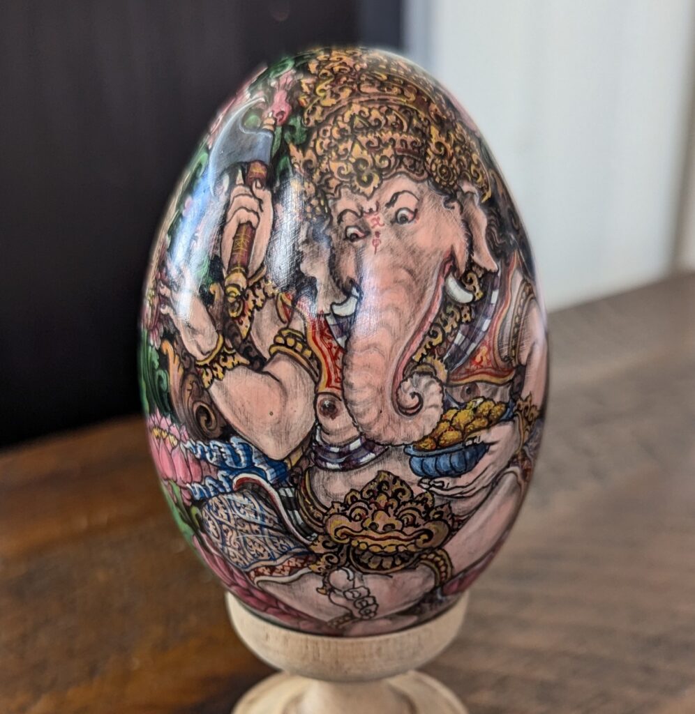 Artisanal interpretation of deity Ganesha painted on a hand-carved wooden telur by Made Muliana.