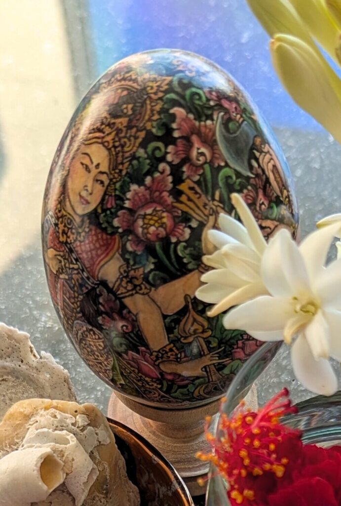 Encircling them are foliage, flowers, creatures, instruments, and ceremonial weapons — each rendered with remarkable intricacy upon the curved surface, a demanding task in itself. The egg becomes a striking masterpiece, carrying the spirit of Bali’s culture and devotion in the palm of the hand.